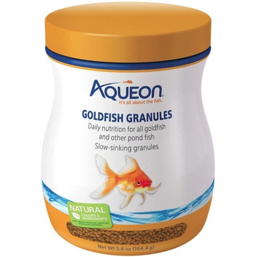 Aqueon Goldfish Granules are loaded with natural colors and ingredients that will provide daily nutrition for the common goldfish, fancy orandas or koi . With added vitamins, minerals and trace nutrients this formula has a higher concentration of ingredients that bring out the colors in fish such as: spirulina, marigold powder, chili powder, and more. Granules sink to the bottom of the aquarium faster than the flake variety and are sometimes preferred for larger fish that can accommodate a larger food portion. Formulated so that fish utilize more of what they eat and create less waste these granules will not cloud the water when fed as directed.