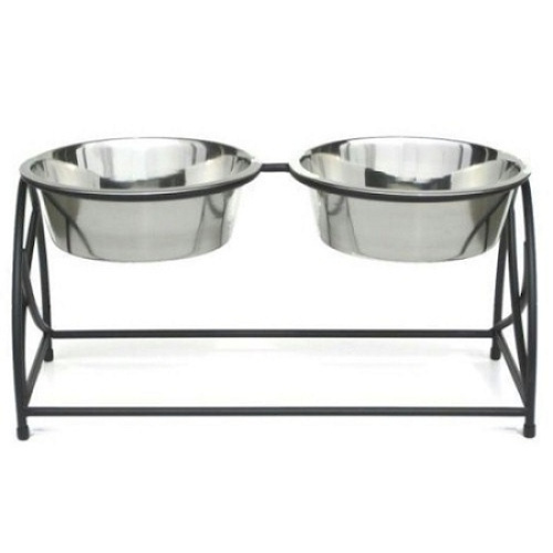 This elevated pet feeder is compact and consumes less space than conventional two-bowl feeders. A traditional style double diner with a butterfly inspired design on its sides. Non-skid plastic feet on legs. Its rounded sides keeps food and water centered for ease of eating. Sturdy wrought iron construction ensures that it lasts a lifetime.